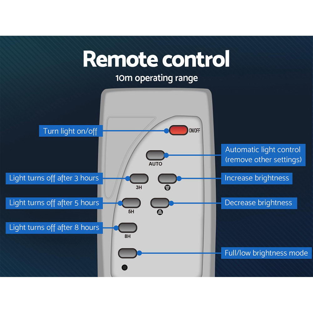 With its larger solar panel and powerful LED lights, our Solar Streetlight shines brighter than most with even faster battery charging. It lights large areas using little power, thanks to the reflector which allows the LEDs to appear six times brighter and the fully automatic and intelligent light control system. The light sensor works to automatically charge the streetlight during the day and light it up at night, while the radar motion sensor turns the light up to full brightness when movement is detected and down to dim light at other times. And with the included easy-to-use remote control, you can set the mode to auto or adjust the timer and brightness to suit your requirements.
