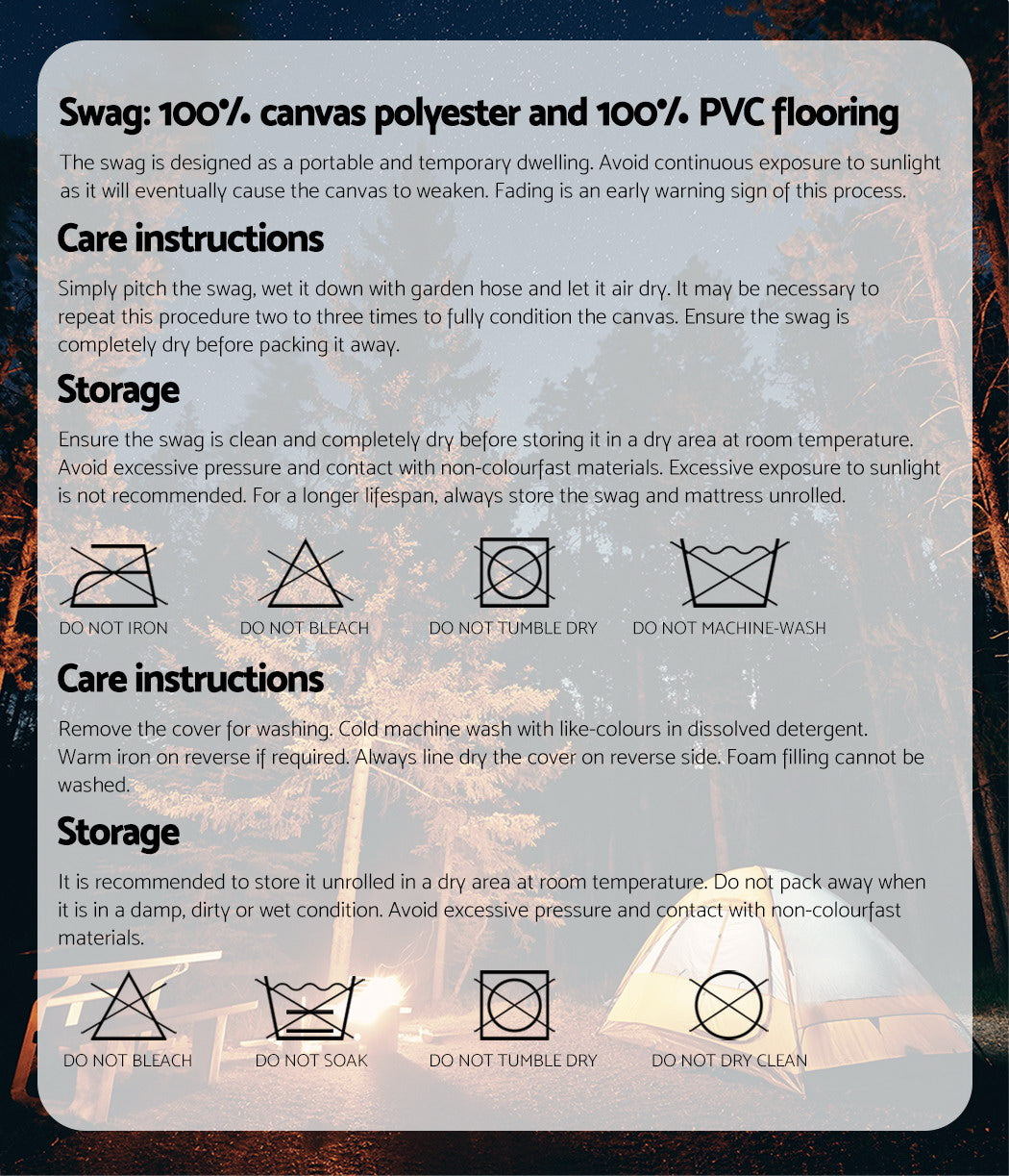 Camping. And enjoying the great outdoors. But it wouldn’t so great if your tent isn't holding up the way the way it should. Or that the creepy crawlies and flying insects are in visitation mode and your tent’s open season. Or ‘it’s so hot in here’ is the whinge of the day and wet dreams are regular rainy night specials. Fortunately, there is salvation. In the form of our ever-reliable free standing swags.