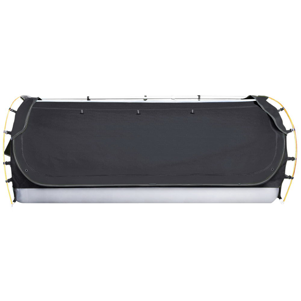 A 12oz 380gsm water-repellent Ripstop canvas cover, 500gsm PVC flooring and 10cm high edges all round. Swagspeak for the ultimate tear-resistant waterproofing. Fully enclosed for privacy with zipped openings for fresh air anytime. Mesh panels to keep insects out. Thick aluminium support poles to hold up the entire set up.